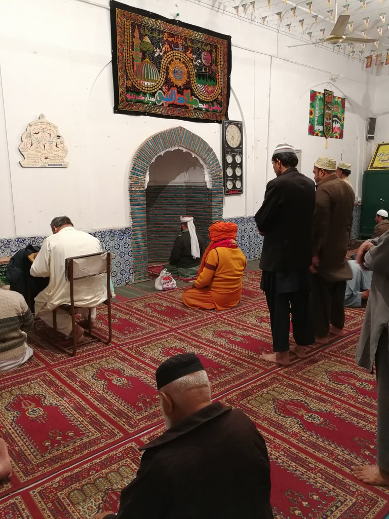 We also visited another shrine within the complex, the shrine of the grandson of Bahauddin Zakariya, known as Shah Rukn-e-Alam. While we were enjoying the view and also observing the people, we heard the call for Maghrib prayer. I told Shabbir that we need to quickly go to the masjid. The masjid was located just beside the shrine but it was small. I was worried that if we were late then we need to perform our prayers outside. We quickly made our wudhu (ablution) and entered the masjid and performed our namaz in the front row following the imam.